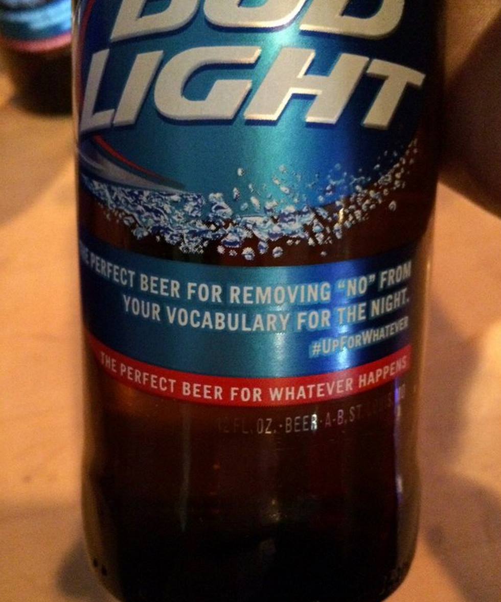 - This is a low quality photo but has a hilarious? background story. Bud light “accidentally” launched a campaign titled “Up for whatever” with the slogan :’The perfect beer for removing “No” from your vocabulary for the night’ (shown below). Whether deliberate or not, it just comes off as Pro Rapist. They apologized but it still looked bad considering it is the go-to-cheap beer used by many young college students. In my expert opinion, this is a publicity stunt. Bud Light tastes like bathwater and has been around awhile…what better way to keep the spotlight on the brand is there than the age old classic: pissing everyone off?